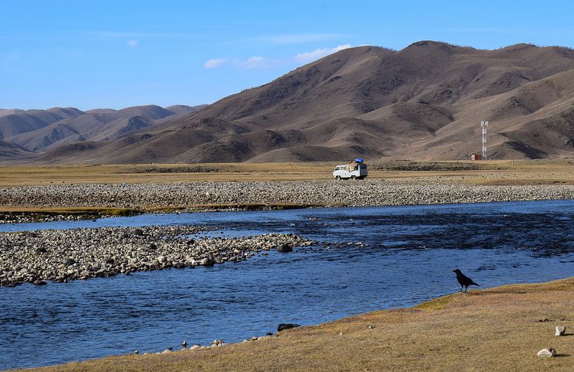 Eine Krähe beobachtet vom Flussufer aus, wie sich ein schwer beladener Kleinbus seinen Weg durch die Steppen der zentralen Mongolei bahnt.