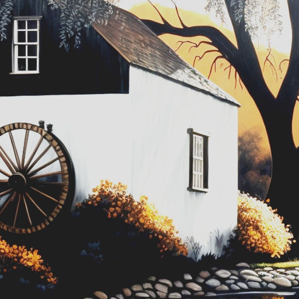Die idyllische Szene zeigt eine malerische Wassermühle am Ufer eines ruhigen Gewässers mit einem Brückenbogen umrandet. Das weiße Gebäude mit seinem dunklen Dach und dem markanten Wasserrad wird von üppiger Vegetation und einem großen, knorrigen Baum mit herabhängenden Zweigen umgeben. Das Wasser spiegelt das Gebäude und die umgebende Landschaft in sanften Wellen. Die Farbpalette ist warm und erdig, mit goldenen Lichtreflexen, die eine friedliche und fast verträumte Atmosphäre erzeugen.