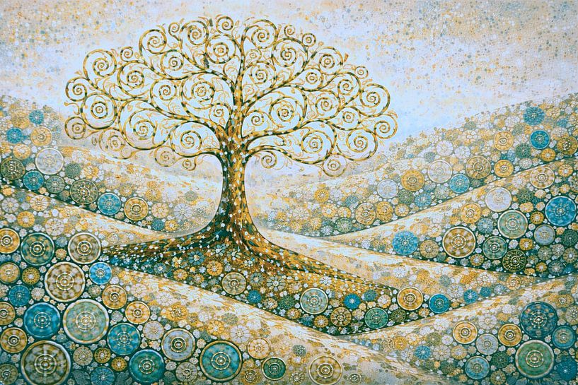 abstrakte Hügel mit dekorativen Kreisen und Lebensbaum....Inspiration Gustav Klimt
