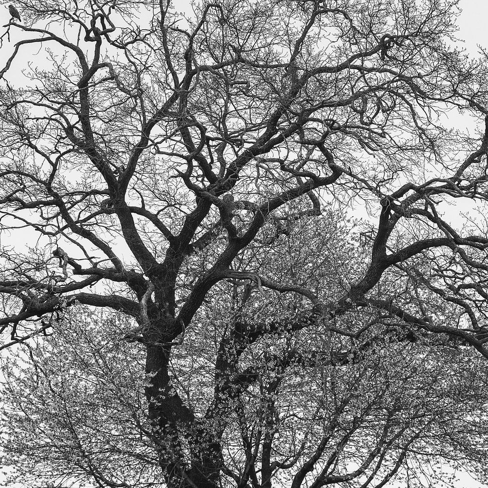 Großer und kleiner Baum vereint, Bayern, Deutschland. Schwarzweiss