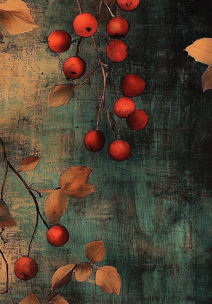 Auf einem üppigen smaragdgrünen Hintergrund funkeln mystische Beeren in tiefen Orangetönen. Ihre samtige Haut fängt das Licht auf subtile Weise ein, während goldene Sprenkel zwischen den Beeren wie ein himmlisches Leuchten tanzen. Die smaragdgrüne Umgebung strahlt eine ruhige, göttliche Energie aus, so dass die Beeren in einem zeitlosen Raum zu schweben scheinen. Jede Beere scheint von Magie durchdrungen zu sein, als ob sie Geheimnisse aus einer anderen Welt birgt, während der Kontrast zwischen dem satten Violett, dem tiefen Smaragdgrün und den schimmernden Goldtönen eine märchenhafte Atmosphäre hervorruft.