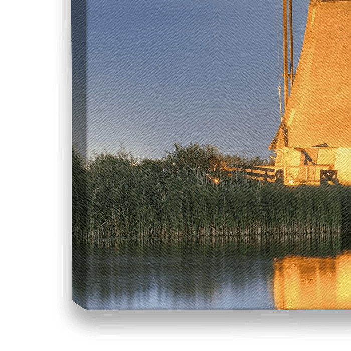Bestelle dieses Rotterdam-Wandbild Beleuchtete Windmühlen in Kinderdijk von Michael Valjak als Reproduktion auf Leinwand, Alu-Dibond, als Poster, Fototapete oder Acrylglasbild.
