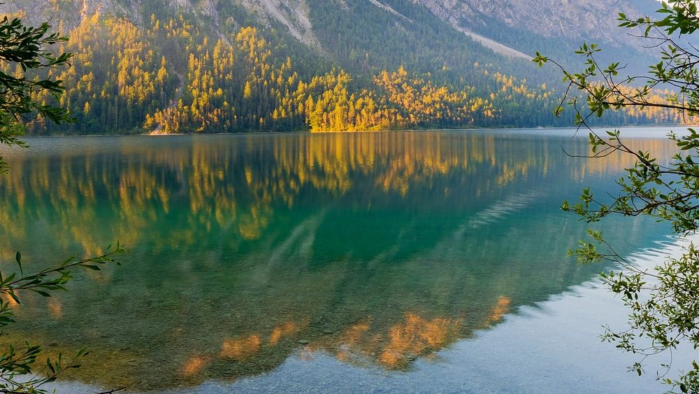 Die Bäume an der Seite bieten einen natürlichen Blick auf die sanften Berge.