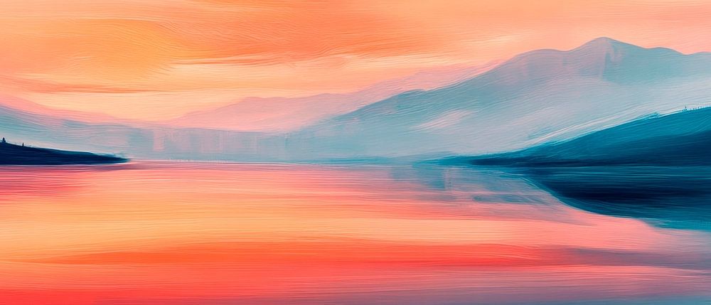 Ein harmonisches Farbspiel aus sanften Pastelltönen reflektiert eine ruhige Seenlandschaft, umgeben von sanften Hügeln. Die warmen Orangetöne verschmelzen mit kühlen Blautönen und erzeugen eine gelassene Atmosphäre. Dieses Kunstwerk eignet sich hervorragend für das Schlafzimmer, wo es eine entspannende und traumhafte Stimmung schafft.