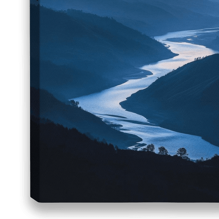 Ein sanfter Fluss schlängelt sich durch schimmernde, neblige Täler, während die Berge majestätisch im Hintergrund aufragen. Der Himmel erstrahlt in warmen, goldenen Tönen, die perfekt mit den kühlen, blauen Schattierungen der Landschaft harmonieren. Diese friedliche Kulisse lädt zum Träumen ein, während die Natur in all ihrer…