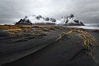 Schneebedeckte Bergformation vor den Dünen eines schwarzen Lavasandstrandes, im Vordergrund eine große mit etwas Gras bewachsene Sanddüne, große Tiefenwirkung - Location: Island, Südküste