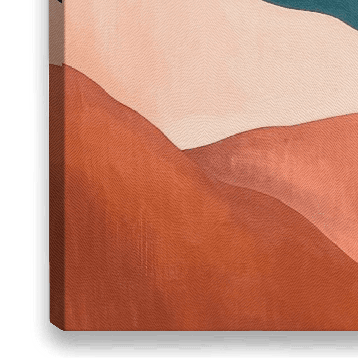 Sanfte, geschwungene Hügel in harmonischen Farben von Blau über Koralle bis zu sanftem Beige schaffen eine beruhigende Atmosphäre. Diese lebendigen, aber dennoch subtilen Farbtöne laden zum Träumen ein und machen das Kunstwerk ideal für ein Schlafzimmer oder ein gemütliches Wohnzimmer, wo sie Entspannung und Geborgenheit fördern können.
