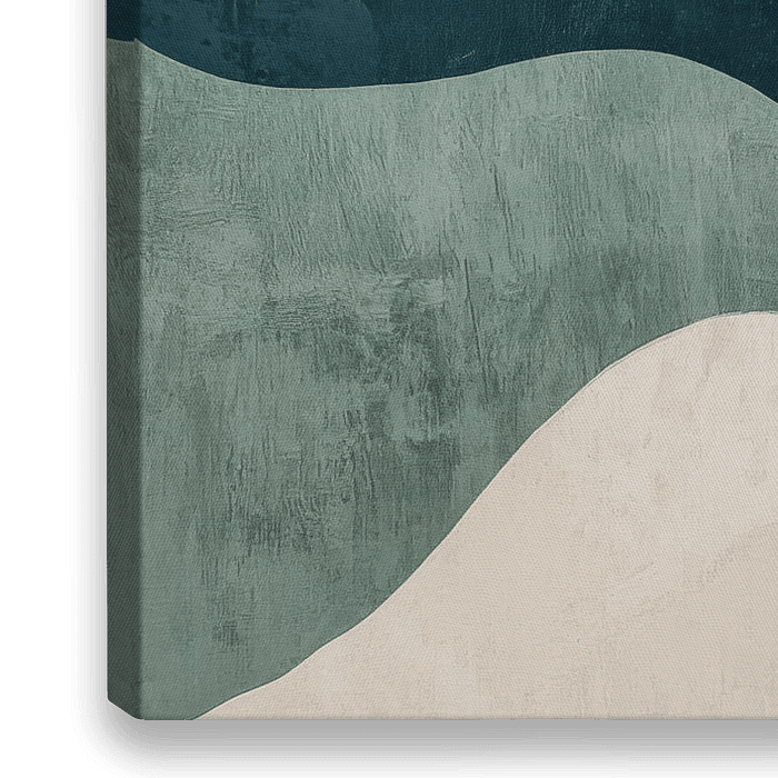 Sanfte Hügel in beruhigenden Blau- und Erdtönen entfalten eine harmonische Landschaft, die zum Träumen einlädt. Die fließenden Formen erinnern an einen entspannten Spaziergang durch die Natur. Ideal für das Schlafzimmer, schafft es eine ruhige Atmosphäre, die Entspannung und Wohlbefinden fördert. Ein perfekter Blickfang für ruhige…