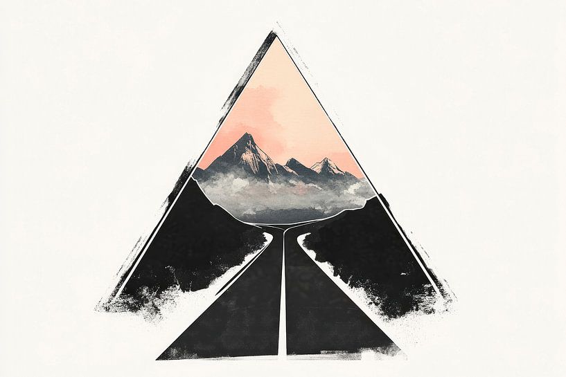 Ein faszinierendes Zusammenspiel von geometrischen Formen und natürlichen Elementen entfaltet sich hier: Eine schmale Straße führt durch majestätische Berge, während der sanfte Farbverlauf des Himmels eine friedvolle Stimmung erzeugt. Perfekt geeignet für das Schlafzimmer, bringt dieses Kunstwerk Ruhe und eine Prise Abenteuer in den Raum.