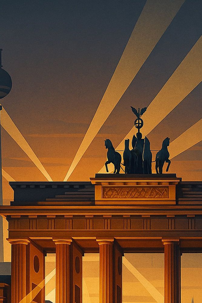 Dieses Kunstwerk ist eine Hommage an die kraftvolle Atmosphäre von Berlin, Deutschland, und fängt das Brandenburger Tor unter einem dramatischen Himmel ein. Die im Stil eines Art-Déco-Reiseplakats gestaltete Komposition zeigt goldene Lichtstrahlen, die die abendliche Skyline durchschneiden und sowohl das historische Denkmal als auch den modernen Fernsehturm hervorheben. Die starke Geometrie und die warmen Farbtöne symbolisieren Widerstandsfähigkeit, Einheit und die sich ständig weiterentwickelnde Identität der Stadt.