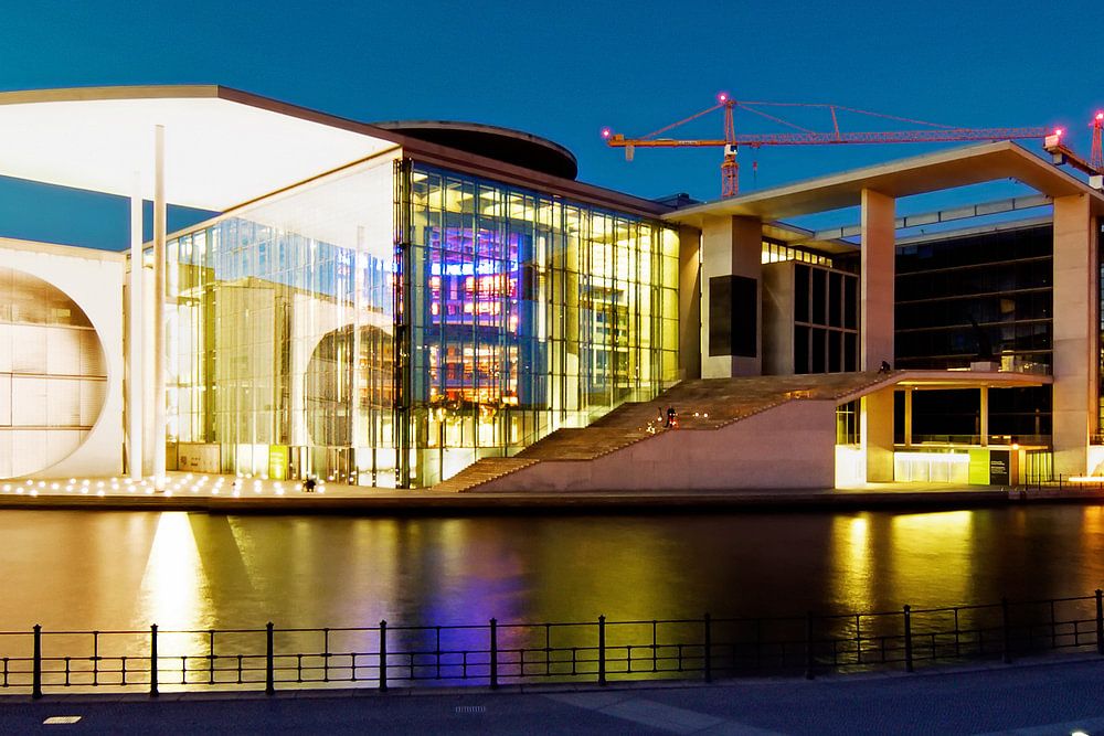 Berlin bei Nacht, eine Impression aus dem Regierungsviertel: Ein Blick vom Reichstagsufer über die Spree auf das Marie-Elisabeth-Lüders-Haus.