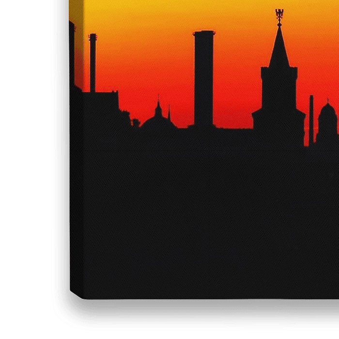 Eine Berliner Stadtsilhouette im Sonnenuntergang. Zu sehen sind u.a. Wahrzeichen die Türme der Oberbaumbrücke, das Berliner rote Rathaus und der Fernsehturm.