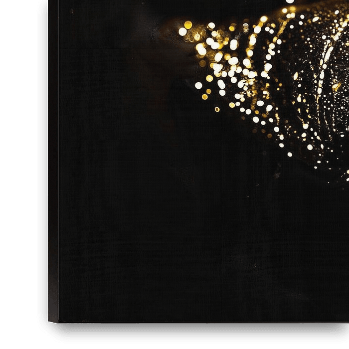 Dieses eindrucksvolle Bild zeigt eine Nahaufnahme von Lippen, die mit funkelndem goldenem Glitter bedeckt sind, kombiniert mit kleinen, klaren Wassertropfen, die das Licht einfangen. Das Ergebnis ist ein faszinierendes Spiel aus Schimmer und Schatten, das diesem Bild eine luxuriöse und fast magische Ausstrahlung verleiht. Dieses…