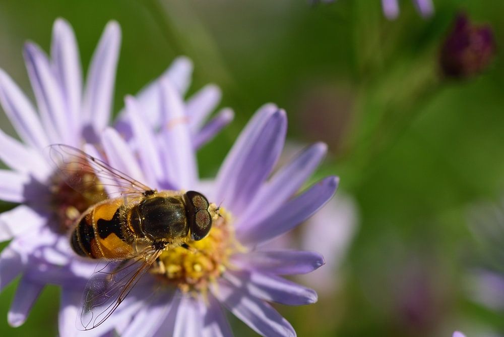 Eine Honigbiene sammelt Pollen auf lila Astern