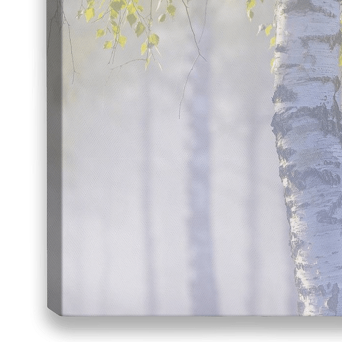 Die zarten Blätter der Birke leuchten im Sonnenlicht. Der Nebel lässt die anderen Birken im Hintergrund verschwinden. Ein beruhigende und doch kraftspendende Naturszenerie.