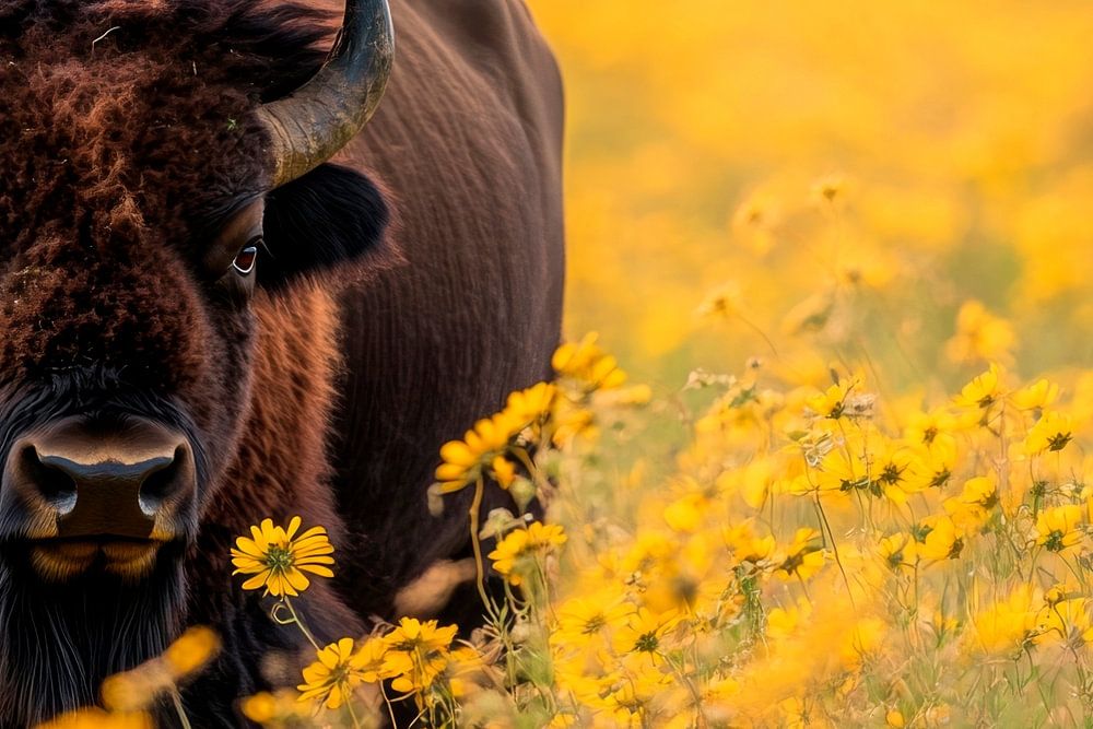 Inmitten des goldenen Blütenmeers schreitet ein majestätischer Bison, seine mächtigen Hörner wie Wächter der Prärie. Das sanfte Licht lässt sein dickes, braunes Fell in warmen Tönen erstrahlen, während die gelben Blumen lebendig um ihn tanzen. Ein Bild der Ruhe und Stärke, das die unberührte Wildnis zum Leben erweckt.