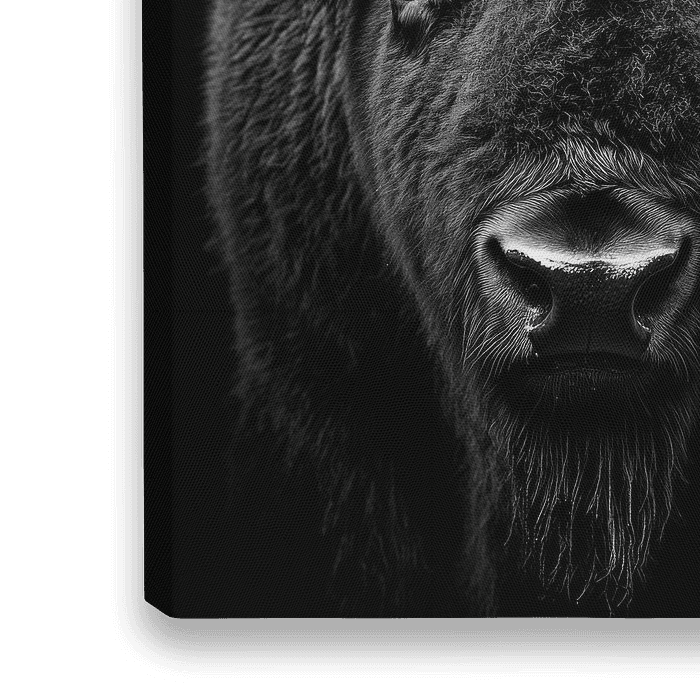 Ein majestätischer Bison blicken direkt in die Seele des Betrachters, umgeben von einer tiefen, geheimnisvollen Dunkelheit. Seine markanten Hörner und die dichte Fellstruktur verleihen diesem Kunstwerk einen kraftvollen Ausdruck. Ideal für das Wohnzimmer, wo es eindrucksvoll Gespräche anregen und eine starke, natürliche Präsenz schaffen…