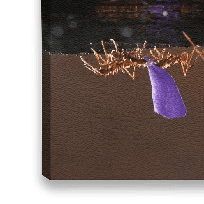 Blattschneiderameisen tragen farbige Blätter. Sie spazieren entlang eines kleinen Sees mit ihrem Spiegelbild im Wasser im Dschungel Costa Ricas. Foto von Bence Mate.