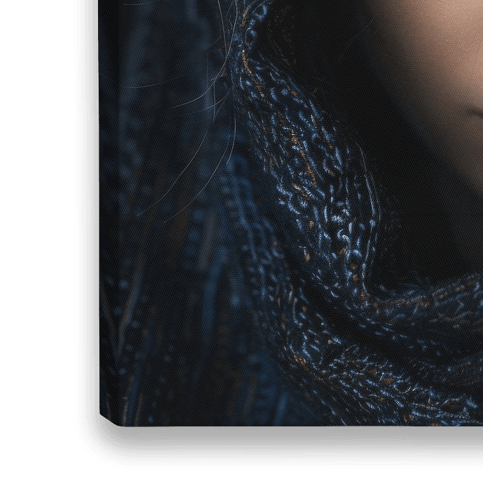 Dieses beeindruckende Porträt zeigt eine Frau mit strahlend blauen Augen, die durch den dunklen, strukturierten Hintergrund und das umhüllende Tuch besonders hervorstechen. Die feinen Details und die intensiven Farben fangen die Tiefe und Geheimnis ihrer Augen ein und schaffen ein fesselndes Kunstwerk. Perfekt für Liebhaber von Porträts und ausdrucksstarker Kunst, bringt dieses Bild eine kraftvolle und zugleich mystische Atmosphäre in jeden Raum.