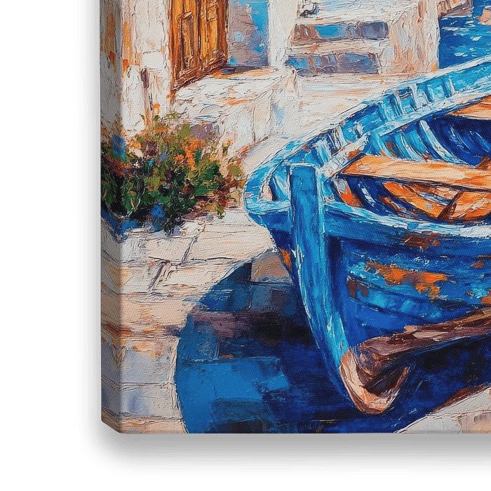 Ein strahlend blauer Himmel spiegelt sich in den sanften Wellen, während ein charmantes Fischerboot in der Sonne schimmert. Umgeben von weißgetünchten Häusern und blühenden Pflanzen, strahlt diese Küstenansicht mediterranen Charme aus. Die warmen Farben und lebendigen Details laden zum Träumen ein, als ob die Zeit hier stillsteht.