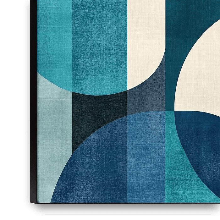 Dieses abstrakte Werk in verschiedenen Blautönen vereint geometrische Formen, die miteinander in einem harmonischen Gleichgewicht stehen. Kreise und Rechtecke bilden eine spannende Komposition, die modern und dennoch ruhig wirkt. Die Farbpalette aus tiefem Blau, Türkis und Weiß verleiht dem Bild eine kühle, beruhigende Atmosphäre. Ideal…