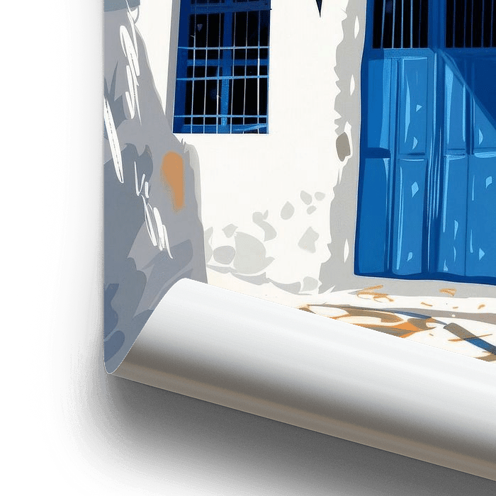 Das Bild zeigt ein charmantes, weiß gestrichenes Haus mit strahlend blauen Türen und Fensterläden. Über dem Eingang hängen leuchtend orangefarbene Orangen. Die harmonische Farbkombination und das Spiel von Licht und Schatten verleihen der Szene eine frische, einladende Atmosphäre, die zum Verweilen einlädt.