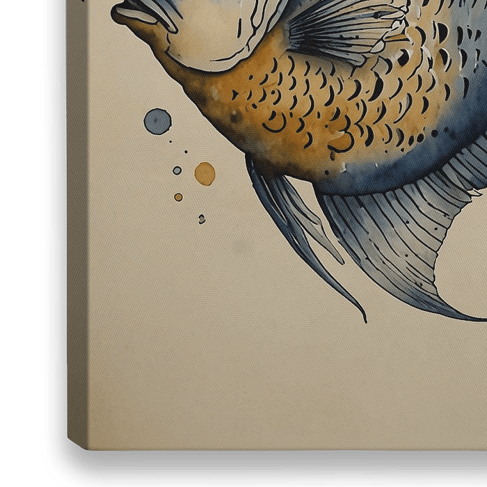 Ein ausdrucksstarker Sonnenbarsch in faszinierenden Blautönen, ergänzt durch goldene Akzente und fließende Details. Die harmonischen Farbübergänge und die sanften Spritzer im Hintergrund verleihen dem Werk eine lebendige, aber dennoch beruhigende Atmosphäre. Ein stilvoller Blickfang, der maritimen Charme in jeden Raum bringt.