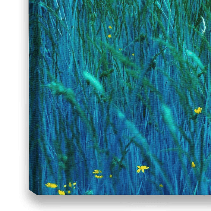 Eine Fotobearbeitung von blühendem Gras. Im Vordergrund sind gelbe Butterblumen als Kontrast im Blau. Weil ich Blau wirklich mag, habe ich das Ganze in diese Farben gelegt.