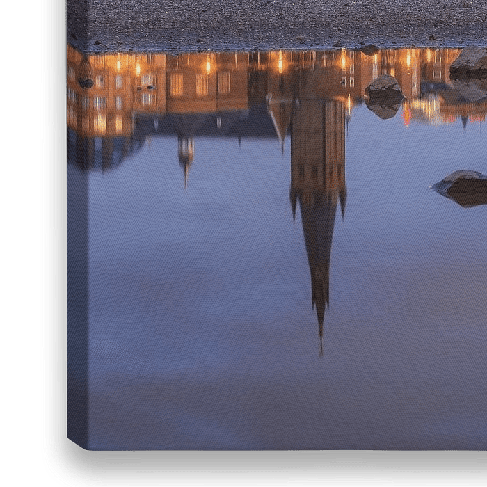 Die Häuser der Altstadt von Düsseldorf spiegeln sich in einer Pfütze neben dem Rhein bei den Oberkasseler Rheinwiesen.