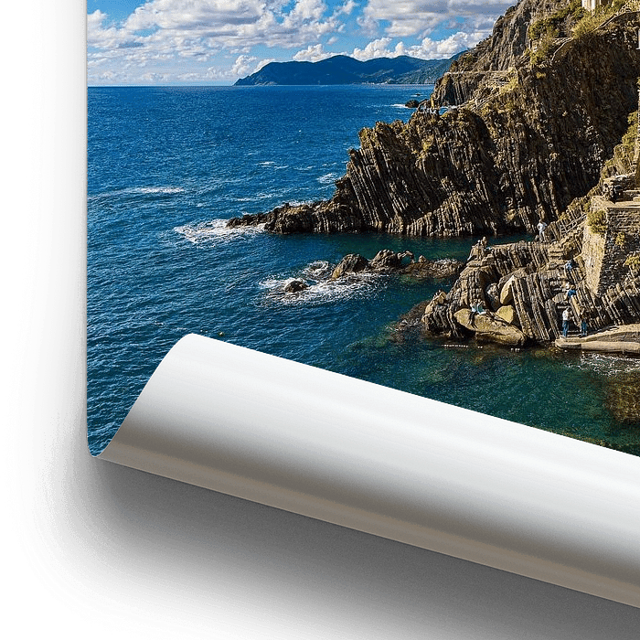 Bestelle das Foto Blick auf Riomaggiore an der Mittelmeerküste in Italien von Rico Ködder als Reproduktion auf Leinwand, Alu-Dibond, als Poster, Fototapete oder Acrylglasbild.