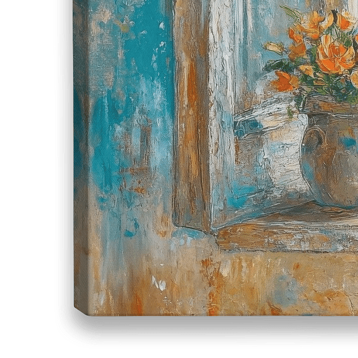 Ein sanfter Druck aus der Ferne, wo das klare Blau des Meeres auf das warme Gold des Sands trifft. Die Fensterläden stehen weit offen, als ob sie die salzige Brise einladen. Ein zarter Blumenstrauß in einer Vase versprüht Lebendigkeit und harmonisiert mit der ruhigen Idylle dieser traumhaften Küstenansicht.
