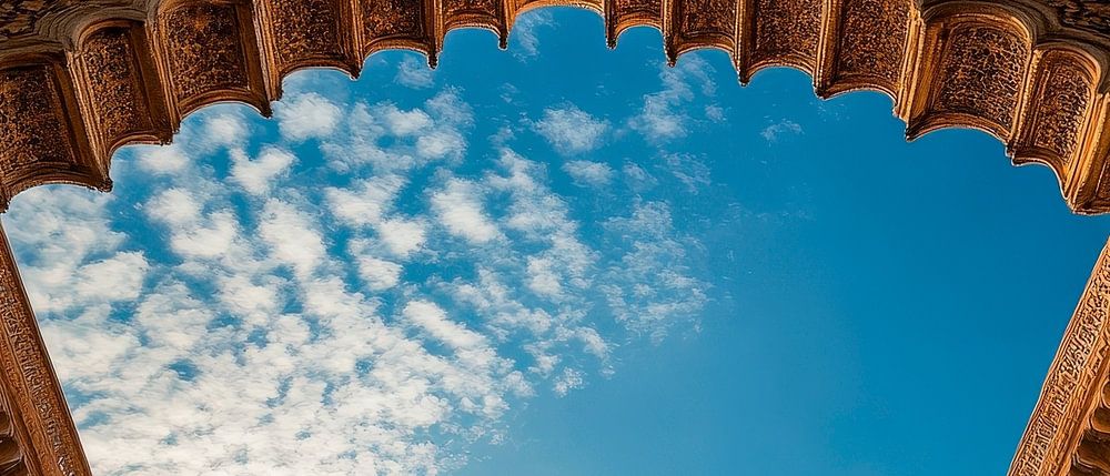 Ein majestätisches Spiel von Licht und Schatten entfaltet sich unter kunstvoll verzierten Bögen, während ein strahlender Sonnenstrahl den Himmel berührt. Die harmonische Verbindung von Architektur und Natur schafft eine Atmosphäre der Ruhe und Inspiration. Dieses Kunstwerk findet seinen idealen Platz im Wohnzimmer, wo es Gespräche anregt und Träume weckt.