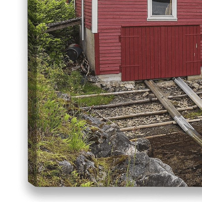 Bestelle dieses Landschafts-Wandbild Blick über den Fjærlandfsjord mit roter Holzhütte in Norwegen von Rico Ködder als Reproduktion auf Leinwand, Alu-Dibond, als Poster, Fototapete oder Acrylglasbild.