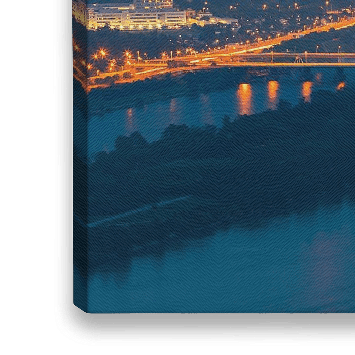 Ein weiter Panoramablick über die österreichische Hauptstadt Wien, gesehen vom Leopoldsberg nach Sonnenuntergang und während der Dämmerung und der blauen Stunde.