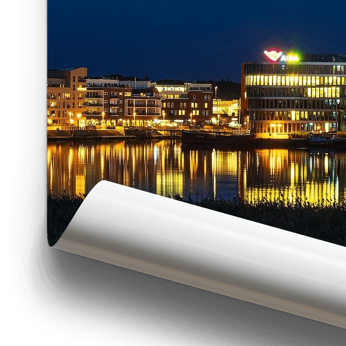 Bestelle das Foto Blick über die Warnow auf die Hansestadt Rostock am Abend von Rico Ködder als Reproduktion auf Leinwand, Alu-Dibond, als Poster, Fototapete oder Acrylglasbild.