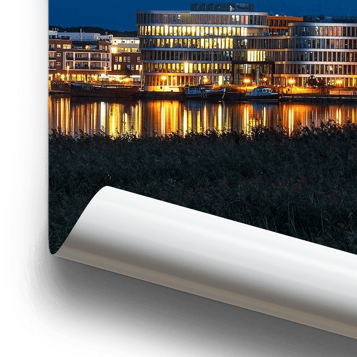 Bestelle das Foto Blick über die Warnow auf die Hansestadt Rostock am Abend von Rico Ködder als Reproduktion auf Leinwand, Alu-Dibond, als Poster, Fototapete oder Acrylglasbild.