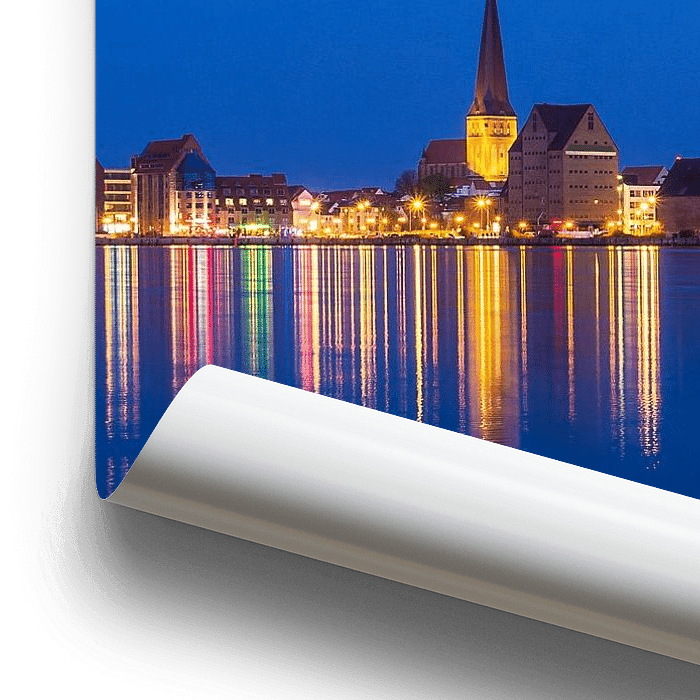 Bestelle das Foto Blick über die Warnow auf die Stadt Rostock am Abend von Rico Ködder als Reproduktion auf Leinwand, Alu-Dibond, als Poster, Fototapete oder Acrylglasbild.