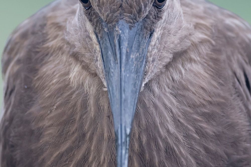 Dieses Bild ist direkt von vorne aufgenommen. Der Blickkontakt ist freundlich und sanft. Der lange Schnabel trägt zur Ausgewogenheit des Bildes bei. Der Hammerkopf ist ein niedlicher Vogel mit einem lustigen Charakter. Das Foto wurde in Südafrika aufgenommen.