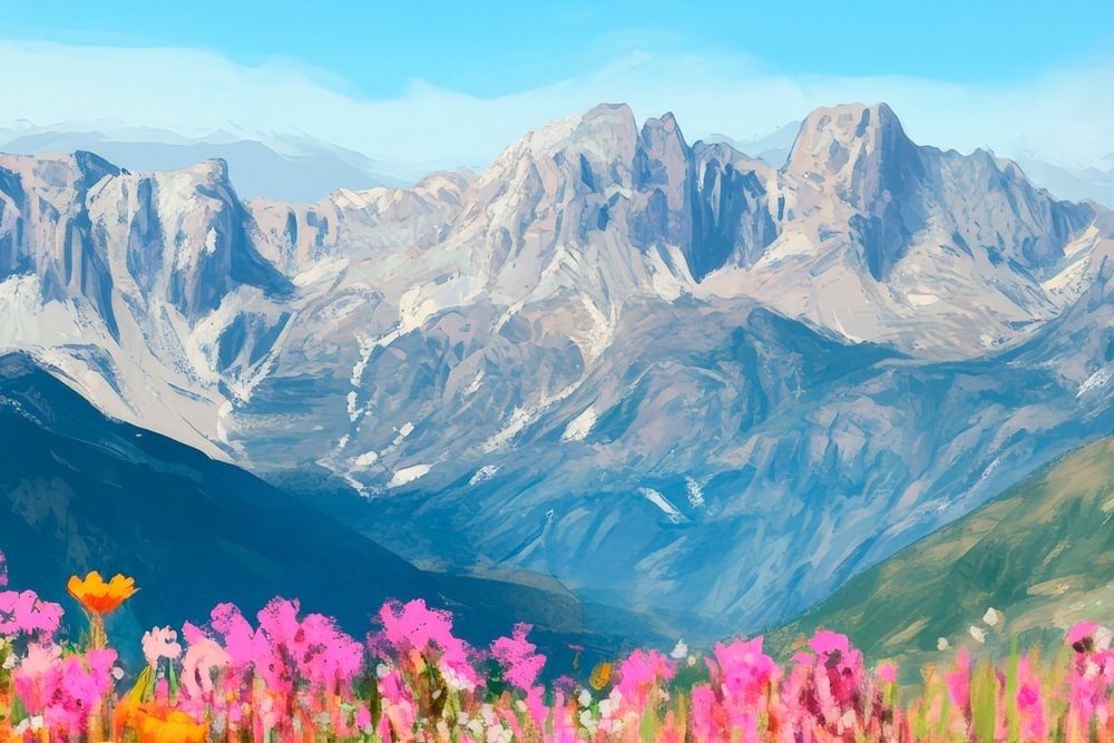 Ein lebendiges Blütenmeer aus leuchtenden Farben verschmilzt harmonisch mit majestätischen Bergen unter einem strahlend blauen Himmel. Diese Szenerie erweckt den Wunsch nach Abenteuer und frischer Luft. Perfekt geeignet für das Wohnzimmer, bringt es eine erfrischende Energie und einen Hauch von Natur in Ihren Raum.