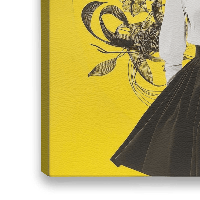 Ein lebendiger Kontrast aus strahlendem Gelb und einem verführerischen Spiel von Schwarz und Weiß entfaltet sich in dieser künstlerischen Komposition. Eine prachtvolle rote Blüte erblüht, wo das Gesicht sein sollte, und verleiht der eleganten Silhouette eine träumerische Aura. Die geschwungenen Linien im Hintergrund erwecken den…