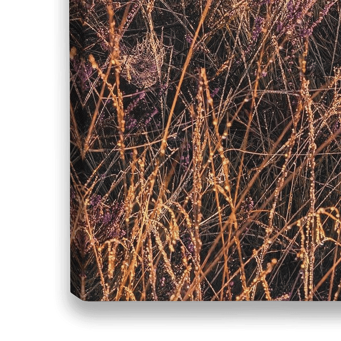 Ein Sonntagmorgen bei Sonnenaufgang im August. Das Heidekraut blüht, die Tautropfen der Nacht bedecken das Land, und das erste Sonnenlicht lässt ein Spinnennetz in bunten Farben erstrahlen.