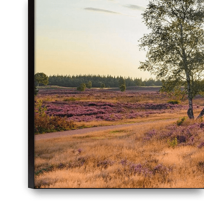 Bestelle dieses Landschafts-Wandbild Blühende Heidekrautpflanzen während des Sonnenaufgangs im Sommer von Sjoerd van der Wal Fotografie als Reproduktion auf Leinwand, Alu-Dibond, als Poster, Fototapete oder Acrylglasbild.
