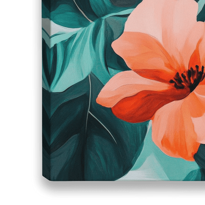 Lebendige Blüten in warmen Rosé- und Pfirsichtönen entfalten sich in voller Pracht, umgeben von saftigem Grün. Diese florale Komposition bringt Frische und Leben in jeden Raum und eignet sich besonders gut für die Küche oder das Wohnzimmer, wo sie eine einladende, harmonische Atmosphäre schafft.