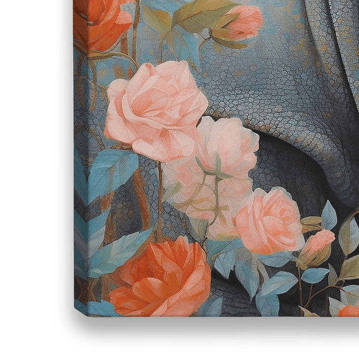Blooming Wild | Wildlife Art - Hier sehen wir ein bezauberndes Gemälde, das ein von Blumen und Schmetterlingen umgebenes Nashorn darstellt. Der Stil ist eine gelungene Mischung aus realistischen Details des Tieres und impressionistischen, leicht abstrakten Elementen in der Flora und im Hintergrund. Die Farbpalette reicht von zarten…