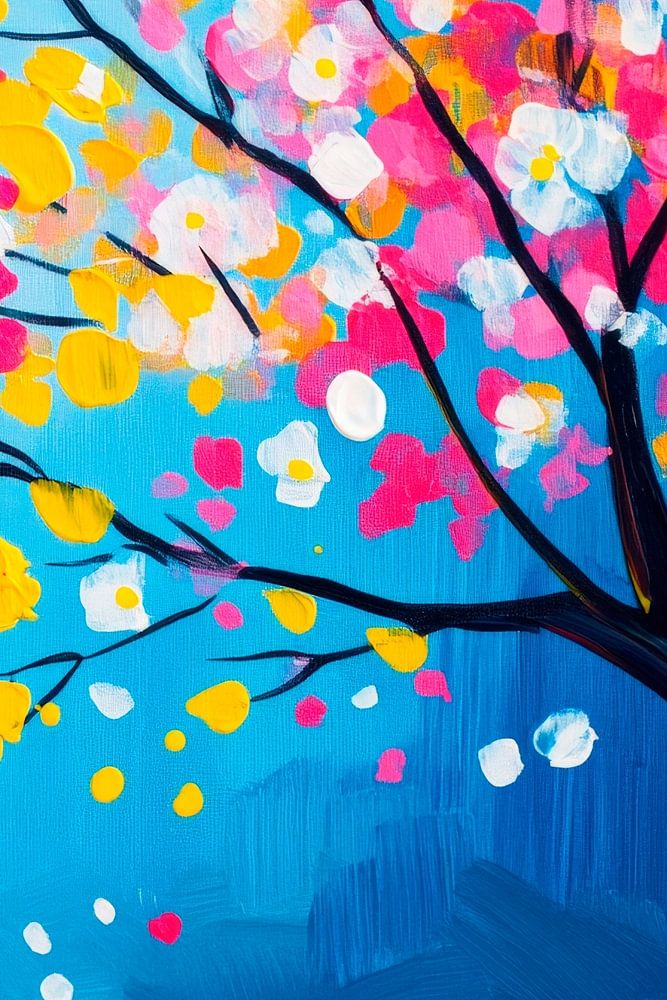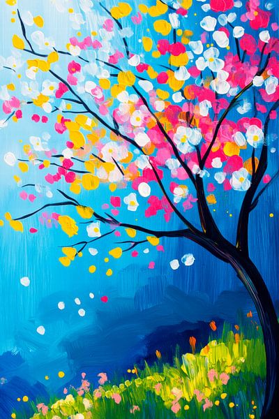Ein lebendiges Spiel aus leuchtenden Farben und sanften Formen entfaltet sich hier, während ein blühender Baum mit bunten Blüten das Auge fängt. Die harmonische Verbindung von Blau, Pink und Gelb versprüht Lebensfreude und Frische. Perfekt für ein Wohnzimmer, das eine einladende, fröhliche Atmosphäre schaffen möchte.