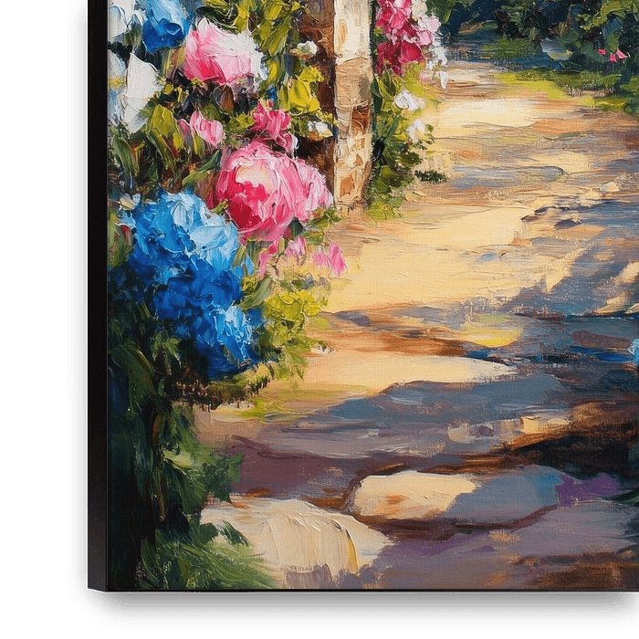 Bestelle dieses Landschafts-Wandbild Blühender Gartenweg von Poster Art Shop als Reproduktion auf Leinwand, Alu-Dibond, als Poster, Fototapete oder Acrylglasbild.