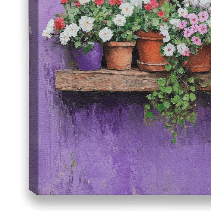 Ein strahlendes Violett umrahmt ein charmantes Fenster, das von blühenden Geranien und rankenden Pflanzen geschmückt wird. Der Holzrahmen strahlt rustikale Gemütlichkeit aus, während die flauschigen Vorhänge einen Hauch von Geheimnis verleihen. Die lebendigen Farben laden dazu ein, das Leben hinter der Fassade zu erahnen und verleihen…