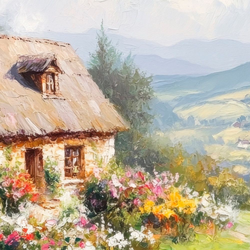 Ein zauberhaftes Refugium umgeben von einem blühenden Farbenmeer, wo sanfte Hügel in die Ferne verlaufen. Das strohgedeckte Häuschen strömt Gemütlichkeit aus, während der Rauch aus dem Schornstein in den klaren Himmel aufsteigt. Sonnenschein küsst die Blumen, die lebhaft um den Pfad tanzen, und verwandelt die Szene in einen unvergesslichen Traum aus Licht und Natur.