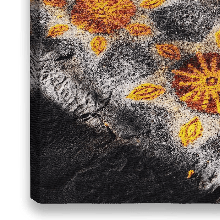Lebendige Blumenmuster tanzen auf dem steinernen Boden, eingefangen im sanften Spiel von Licht und Schatten. Die warmen Gelbtöne strahlen eine einladende Energie aus, die jeden Raum erhellt. Ideal für die Küche, wo Kreativität und Genuss zuhause sind, bringt dieses Bild gleich Freude und Leben in den Alltag.