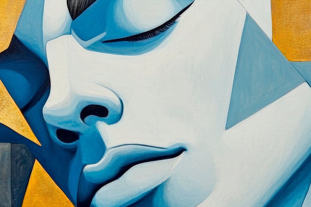 Die harmonische Verschmelzung von kühlen Blautönen und leuchtendem Gold erzeugt eine faszinierende Aura. Die sanften Gesichtszüge scheinen in meditativer Ruhe zu schweben, während geometrische Formen dynamisch um sie herum tanzen. Dieses Kunstwerk eignet sich perfekt für ein modernes Wohnzimmer, wo es als inspirierender Blickfang und Gesprächsstoff dient.